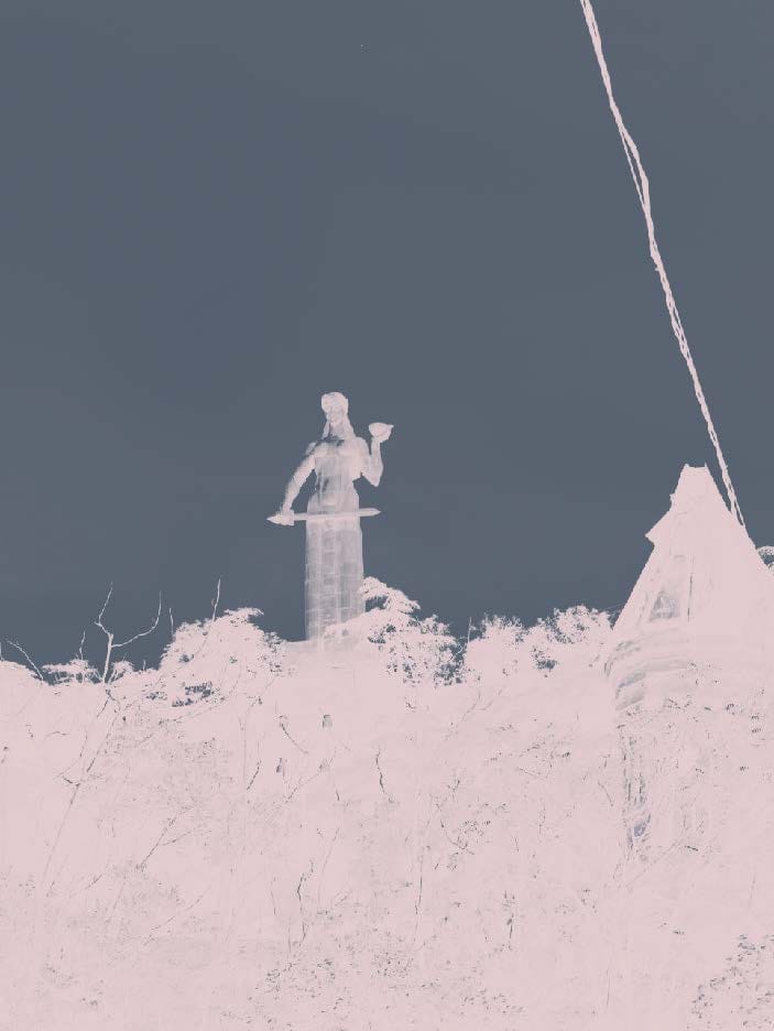 Bebia, or the grandmother. She holds flowers in her hands, in the exact same stance one would hold two pistols. Flowers for freedom? Or firearms? I would like to think that just like Kartlis Deda, the grandmother offers you flowers if you come with kindness, as a guest to her house. The glare in her eyes suggests that should you come to her house as an enemy, you’ll be met with metal, not petals.